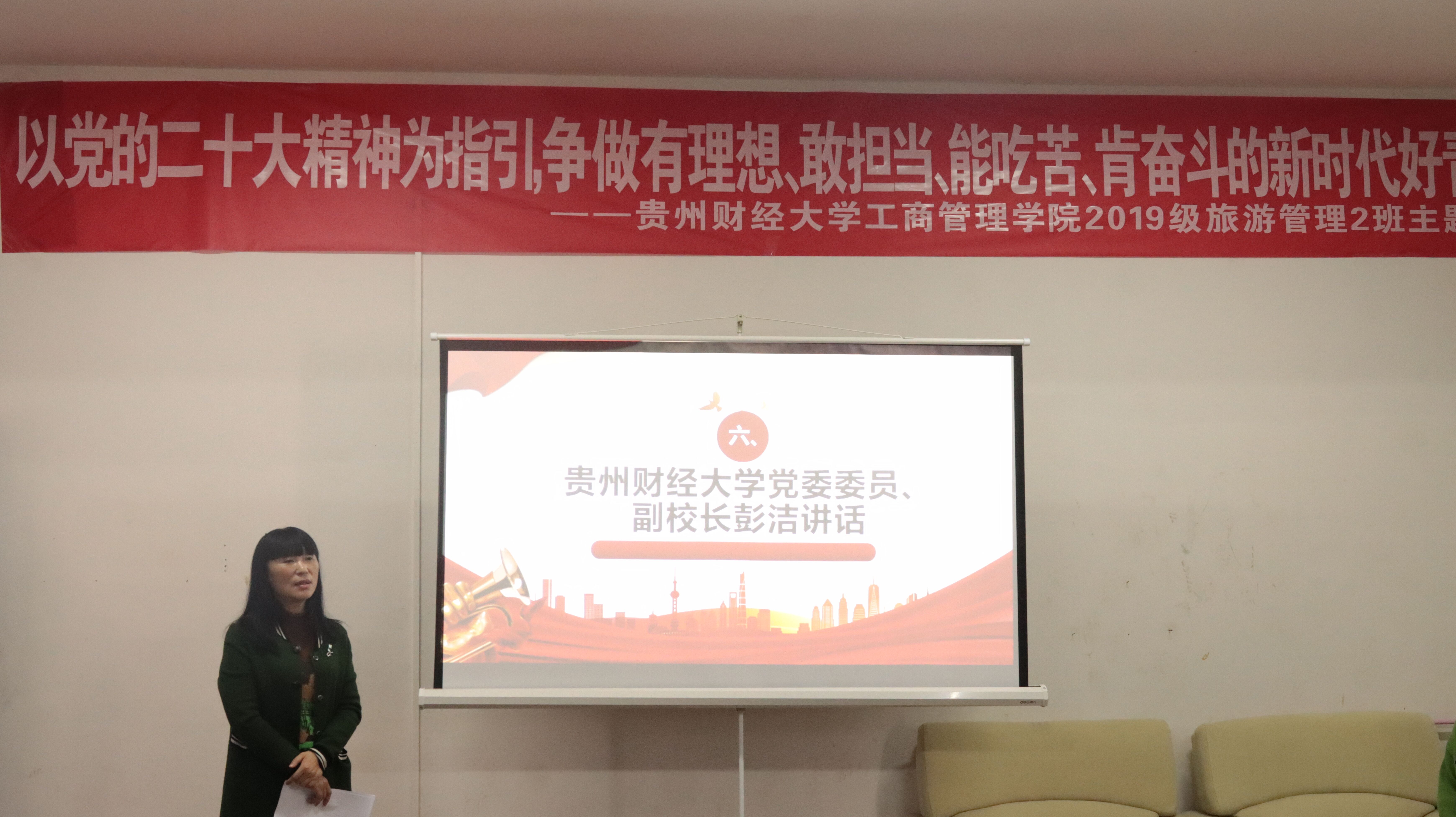 11月18日上午,英国365集团公司官网在员工社区翠竹2栋四楼活动室开展了“以党的二十大精神为指引,争做有理想、敢担当、能吃苦、肯奋斗的新时代好青年”主题班会。公司党委委员、副董事长彭洁,英国365集团公司官网党委书记杨阳,党委副书记何瑞,2019级旅游管理二班全体同学参加,本次班会由蒋小芳老师、苏浩鹏同学主持。