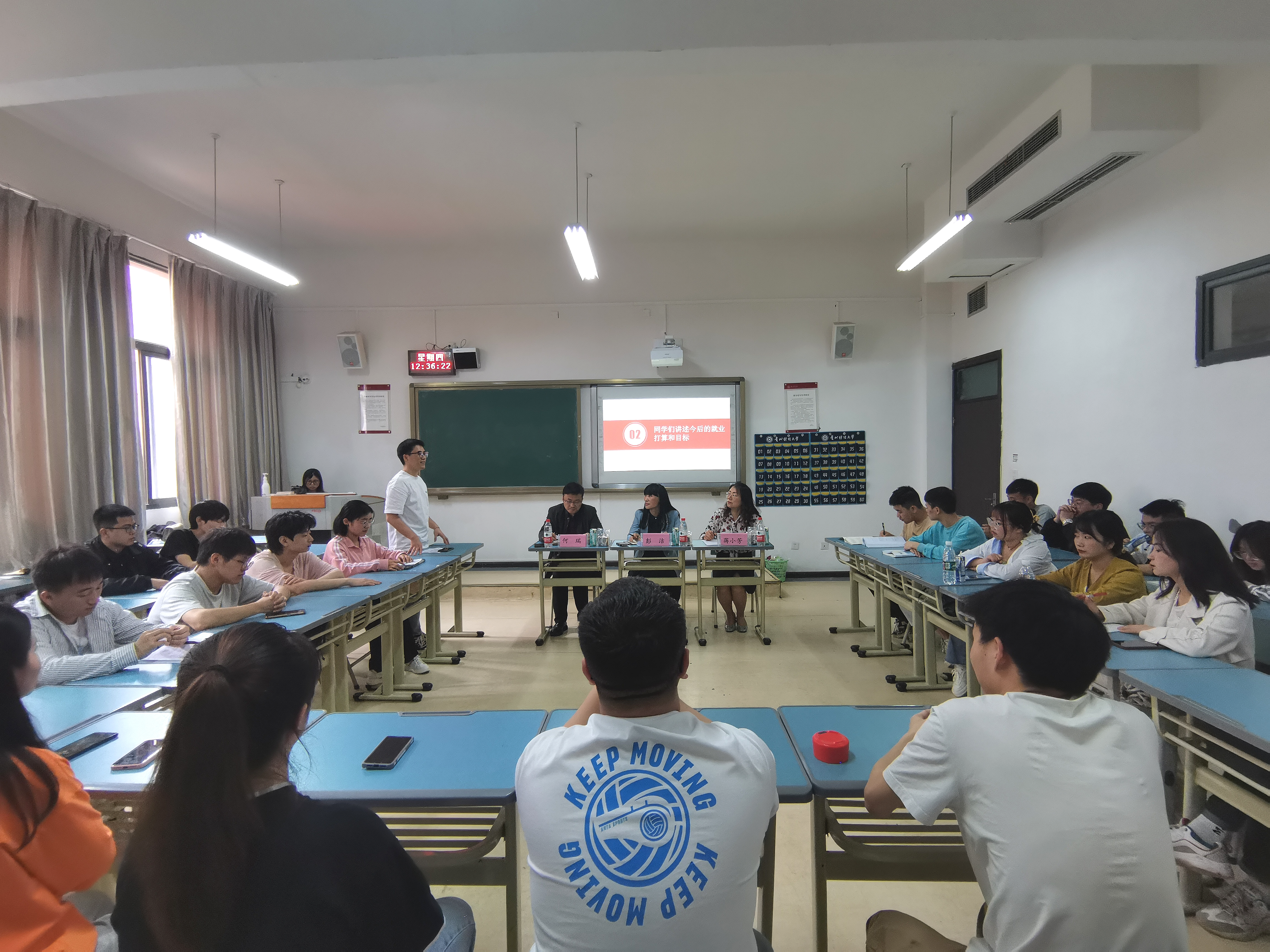 班会由辅导员蒋小芳老师主持。首先,在认真领会习近平总书记考察中国人民大学重要讲话精神的基础上,同学们就今后考公、考研、创业以及就业等方面,踊跃分享了自己的规划与思考,并提出了在就业方面所遇到的困惑与痛点。