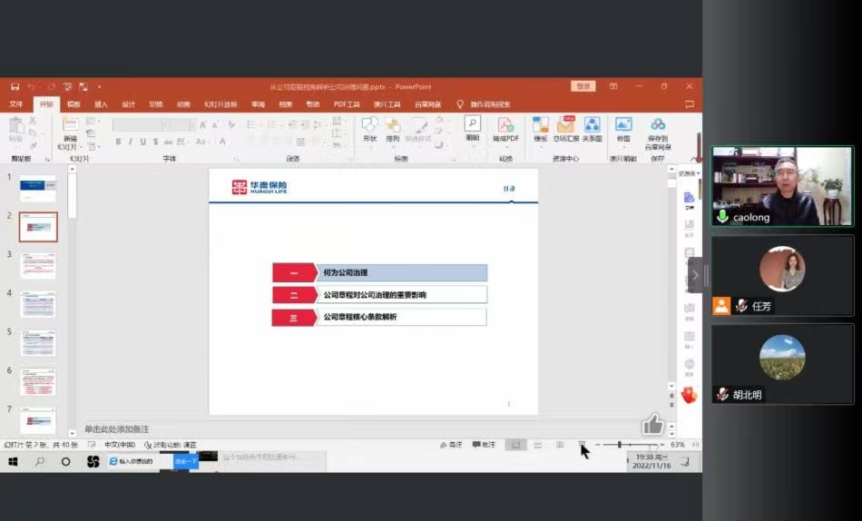 11月16日晚19点30分,应英国365集团公司官网的邀请,华贵人寿保险股份有限公司董事、副总经理、董事会秘书曹龙先生为公司师生作题为“从公司章程视角解析公司治理问题”的专题讲座,公司副经理胡北明教授主持讲座并致辞,英国365集团公司官网MBA/MTA中心2020级、2021级和2022级的90余位同学通过线上的方式聆听讲座。