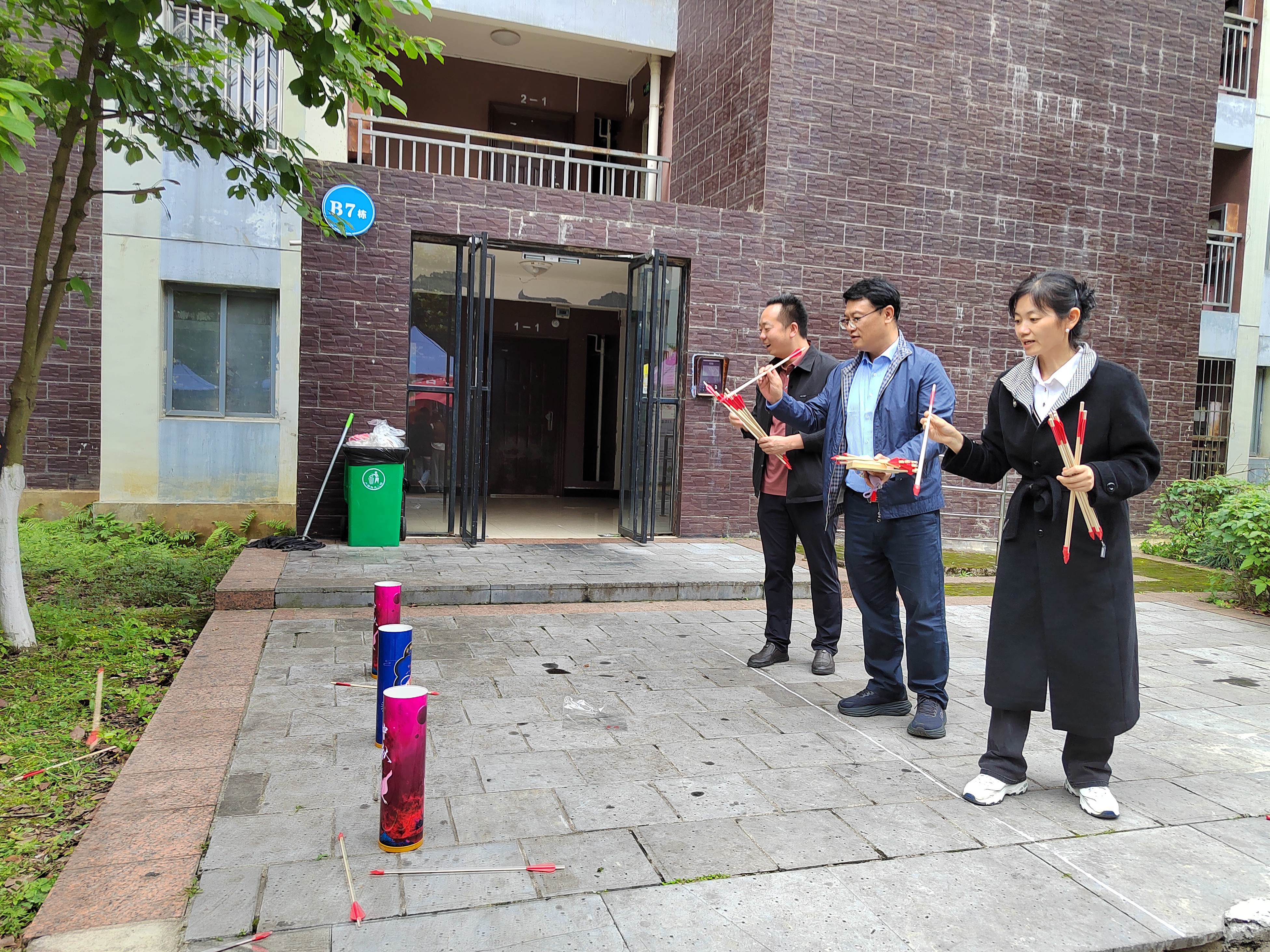 在有奖投壶活动中,参与者签到后获10支箭矢,于2米外投掷到筒里,按照投中箭矢的数量获得相应的奖品,吸引了众多的老员工和小朋友参与,趣味性十足;毛笔书法展示提供空白纸扇,供师生书写端午诗句或创作个性化扇面,传递节日祝福;端午挂件DIY活动备齐粽叶、麻绳、干花等材料,参与者可亲手制作迷你香囊或装饰摆件,增加了节日的氛围。
