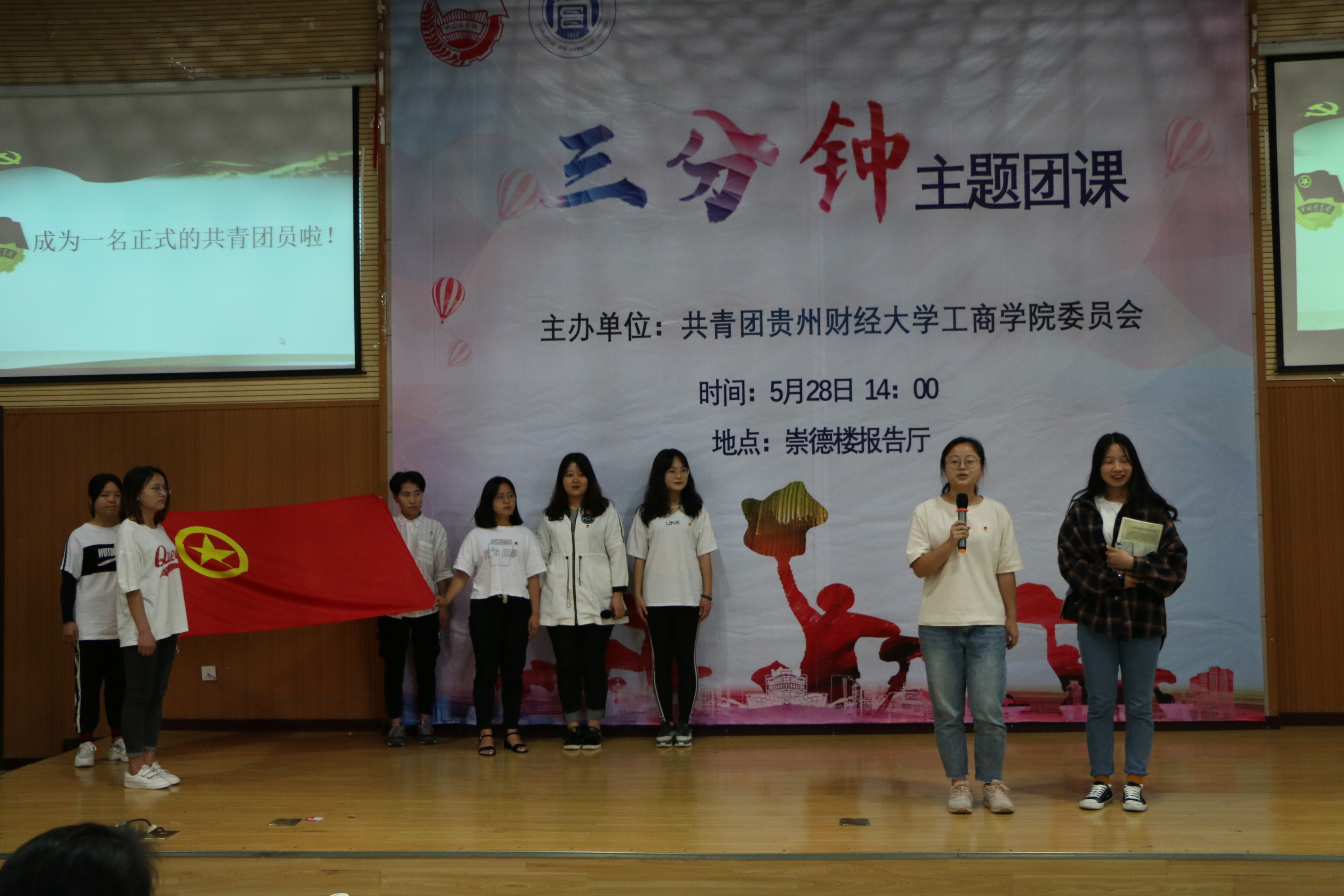 为纪念五四远动100周年及新中国成立70周年,坚持不懈用习近平新时代中国特色社会主义思想构筑青年一代的强大精神支柱,5月28日,工商公司在崇德楼报告厅举办“我和我的祖国”三分钟主题团课活动。校团委书记李文龙、工商公司党委副书记高艳妮、辅导员老师何琴、崔桂美以及160余名青年团员参加了活动。