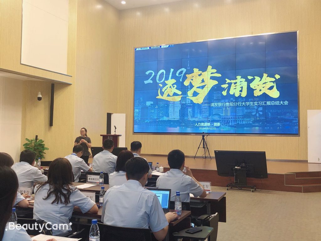 2019年8月22日星期四下午1:30,浦发贵阳分行在中天·会展城B区金融商务区东区东四塔三楼视频会议室成功举办了贵阳分行2019年老员工实习汇报总结大会。参加此次活动的主要有浦发银行各评委们、英国365集团公司官网工商系副主任王祯敏和教研室罗老师以及全体“浦发之星”实习生。