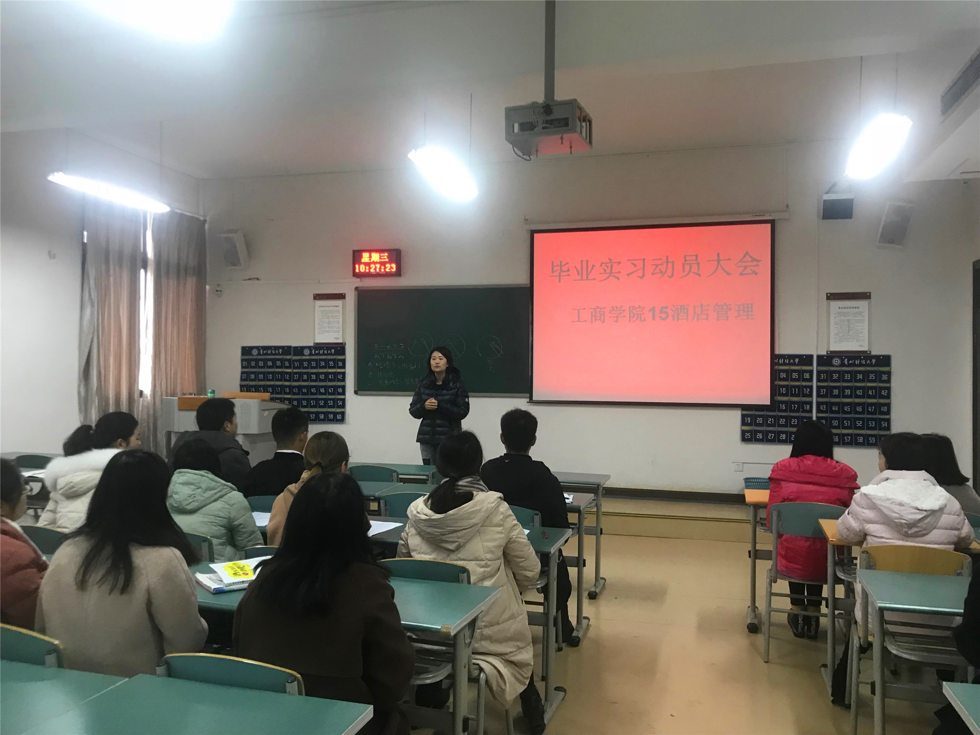 2018年12月12日,工商公司15级酒店管理专业在崇德楼416教室召开毕业实习动员大会,旅游系副系主任朱靓老师主持本次会议。