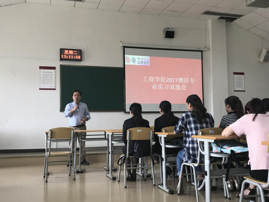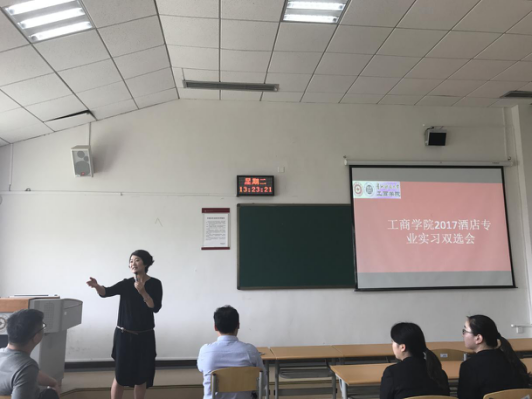 6月6日下午,工商公司在崇德楼520教室举行2014级专业实习双选会。据统计,本次双选会吸引了包括贵阳喜来登大酒店、贵阳中天凯悦酒店等6家国际一线品牌酒店参会,共计提供岗位达120多个。工商公司副经理胡北明教授出席,双选会由旅游系副主任朱婧老师主持,实习带队教师以及2014级旅游系的旅游管理和酒店管理100余名员工参加了双选会。